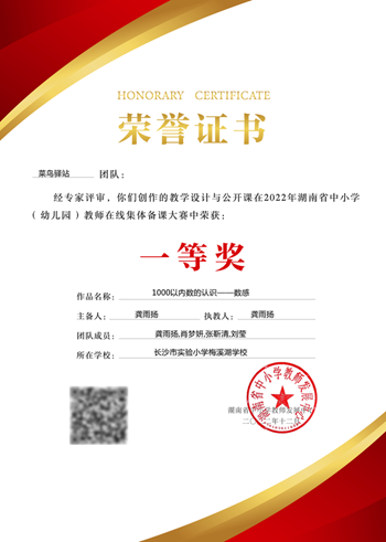 在本次在线备课大赛中,该校参赛教师积极参与、精心备课、认真研讨、众筹众智、深入钻研课堂教学艺术,充分展示了长沙市实验小学梅溪湖学校优良的教育教学教研氛围。其中,数学团队《1000以内数的认识——数感》主备人:龚雨扬,(团队成员:龚雨扬,肖梦妍,张靳清,刘莹)荣获省级一等奖;