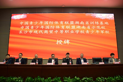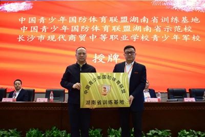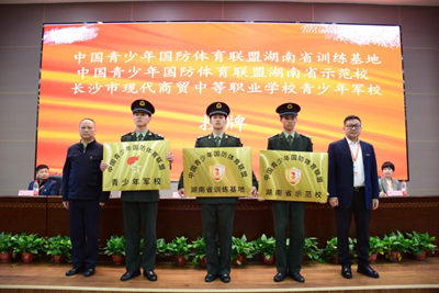 4月24日上午,“中国青少年国防体育联盟湖南省训练基地”、“中国青少年国防体育联盟湖南省示范校”、“长沙市现代商贸中等职业学校青少年军校”授牌仪式在长沙现代商贸学校举行。中国青少年国防体育发展联盟湖南省工作部顾问文秋林,中国青少年国防体育发展联盟湖南省工作部主任、湖南省青少年消防教育基地主任、湖南省紧急救援协会常务副会长文勇到校为学校授牌。授牌仪式由副校长黄鹏主持,学校校长黄旭教授、副董事长吴闯、党支部书记兼常务副校长唐启金、副校长陈利维、党支部副书记李业亮及全体中层干部、12个国防班师生参加。