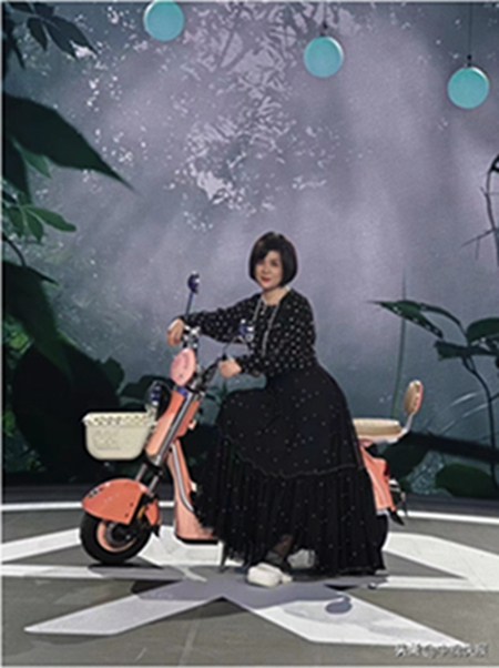 图:爱玛集团副董事长段华与爱玛蛋蛋系列电动车合影
