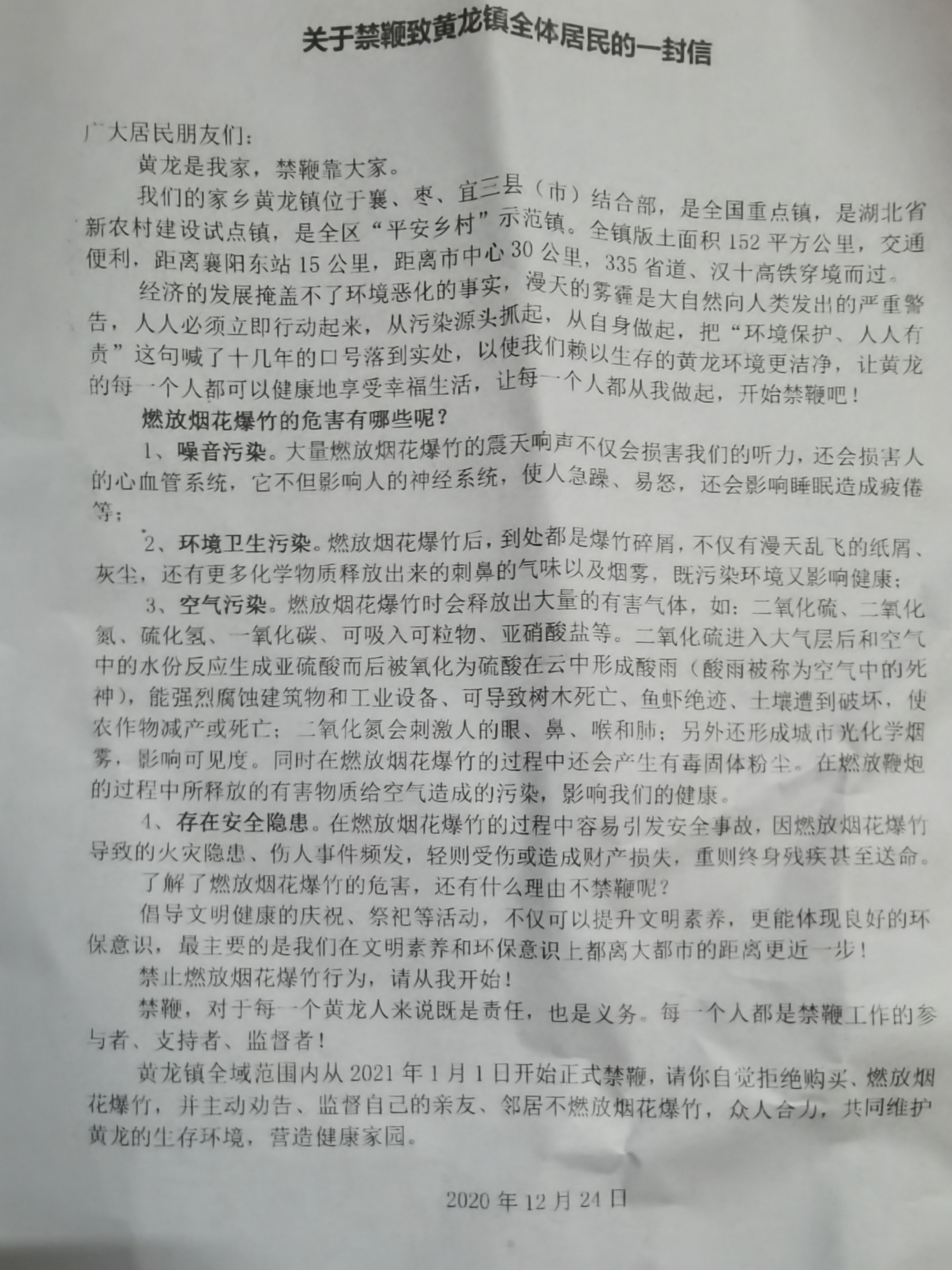 三农电视台湖北襄阳讯(通讯员:杨涛 朱翠)12月24日,革命苏区襄阳黄龙镇召集全体机关干部、各村支部书记和镇直单位负责人近百人在镇三楼会议室召开了村(居)民自治全域禁鞭动员会。要求全镇自2021年1月1日起,全域禁鞭。要求各村进行广泛宣传,下发禁鞭管理办法,发放《关于禁鞭致黄龙镇全体居民的一封信》,宣传到家喻户晓,并逐户签定禁鞭协议,以此提高全镇居民大气污染环保防治意识,营造蓝天白云和绿水青山的生活环境。