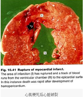 在心肌梗死后1~2周内,常发生心脏破裂,约占致死病例3%~13%。原因是梗死灶失去弹性,心肌坏死、中性粒细胞和单核细胞释放水解酶所致的酶性溶解作用,导致心壁破裂,心室内血液进人心包,造成心包填塞而引起急死。