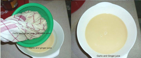 1.蒜头去皮,姜去皮切小片,放入榨汁机榨汁,或者放入搅拌器打成浆,用网布隔渣,绞出汁。