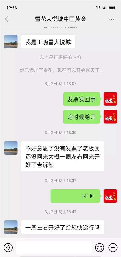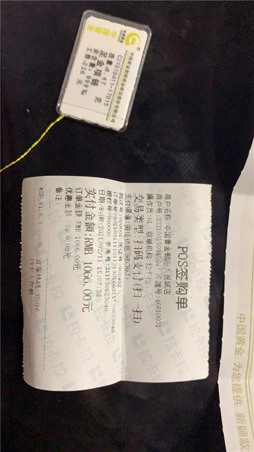 据时代安全新闻网消息:二零二一年二月十一日,大年三十,王小姐在北京朝阳大悦城地下一层中国黄金购买饰品。付完账后服务员说让留下地址发票寄过家里,并答复一周之内寄到,而且还加微信。