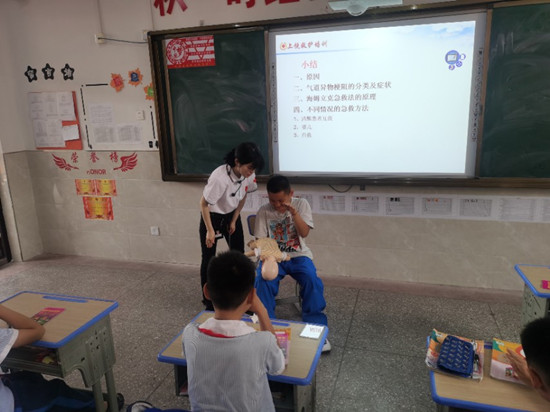 广信区红十字会工作人员向师生们进行了演练伤员心肺复苏、创伤止血、包扎等,进一步丰富了学生消防救护知识,提升了安全意识,并达到“教育一个孩子,带动一个家庭,促进整个社会”的安全防范目的。