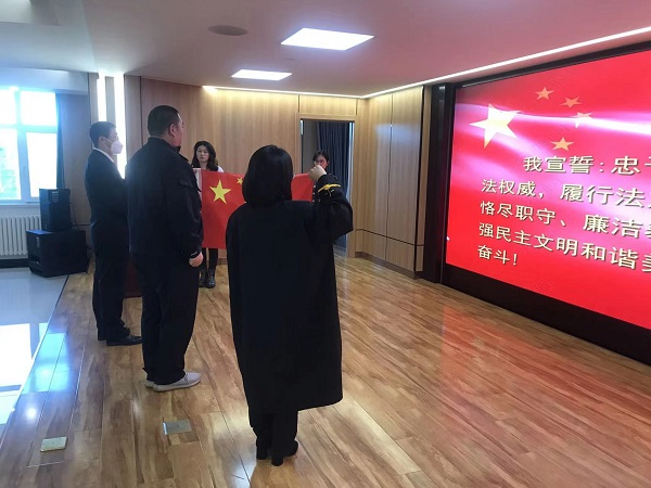 宣誓仪式现场气氛庄严,领誓人左手持《中华人民共和国宪法》,三人列队面向国旗,右手举拳,宣读誓词,“我宣誓:忠于中华人民共和国宪法,维护宪法权威,履行法定职责,忠于祖国、忠于人民,恪尽职守、廉洁奉公,接受人民监督,为建设富强民主文明和谐美丽的社会主义现代化强国努力奋斗!”参加宣誓的干警表示,将不忘初心、牢记使命,始终做到对党忠诚,在今后的工作中坚守信仰、崇尚法律、廉洁奉公,切实履行承诺、不辱使命,不负党和人民的殷切期望。