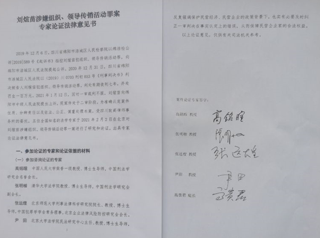 中国人民大学荣誉一级教授、博士生导师、中国刑法学研究会名誉会长高铭暄;清华大学法学院教授、博士生导师、中国刑法学研究会副会长张明楷;北京师范大学刑事法律科学研究院院长、教授、博士生导师、中国犯罪学学会常务理事、北京企业法律风险防控研究会会长张远煌;北京大学法学院民法研究中心主任、教授、博士生导师、中国法学会民法学研究会副会长尹田;最高人民法院审判委员会原委员、刑事审判第五庭原庭长,国家法官学院教授高贵君等全国知名法学专家,于2021年2月2日在北京对刘煊苗涉嫌组织、领导传销活动罪一案进行了研究和论证,并出具了专家论证法律意见书。