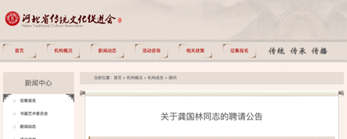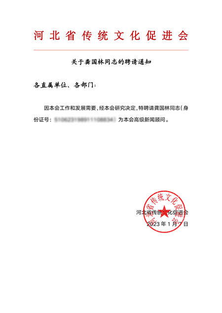 近日,因河北省传统文化促进会工作和发展需要,经协会研究决定,特聘请龚国林同志为本会高级新闻顾问。