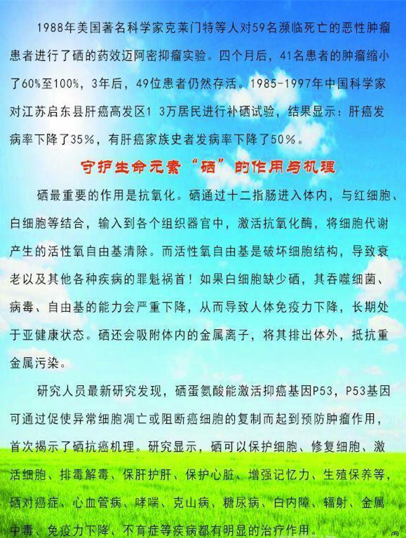 科学界研究发现,血硒水平的高低与癌的发生息息相关。大量的调查资料说明,一个地区食物和土壤中硒含量的高低与癌症的发病率有直接关系,例如:此地区的食物和土壤中的硒含量高,癌症的发病率和死亡率就低,反之,这个地区的癌症发病率和死亡率就高,事实说明硒与癌症的发生有着密切关系。同时科学界也认识到硒具有预防癌症作用,是人体微量元素的“防癌之王”。