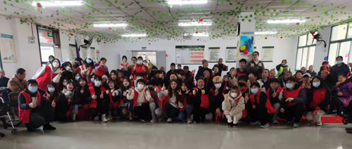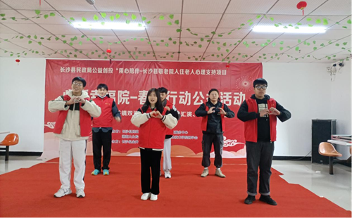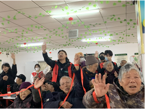 2022年3月5日长沙县金井镇双江敬老院好不热闹,食堂里座无虚席,40多位红马甲志愿者穿梭在老人中间,台上一群学生正在跳手语舞,台下每一位老人的身边都蹲着一位志愿者,正陪着老人一起做动作,配合台上互动,更精彩的是团体心理辅导环节,在德邻社工的引导下,一条红丝带穿过全场100多位老人、护理员和志愿者,所有人手拉手、心连心同唱一首歌,场面震撼温馨感人。