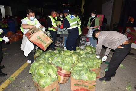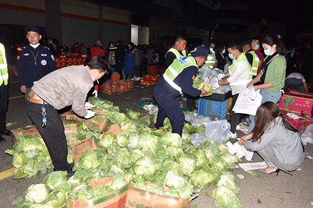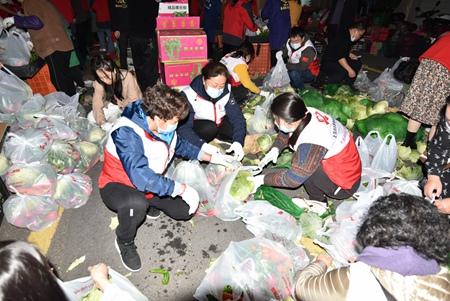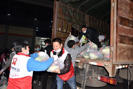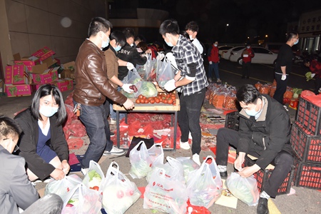 这是2022年4月4日晚22时,在江西省上饶市江天农博城拍摄的江天农博城员工、上饶市志愿者协会等百余人连夜分拣近5000份蔬菜包的画面。(张晓珊、艾世民摄影报道)