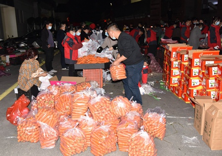 江西省婺源县抗疫牵动着上饶人民的心,2022年4月4日晚21时许,上饶市江天农博城接到上饶市政府紧急调拨通知,急需从江天农博城市场、铅山万亩蔬菜基地,调度采摘各类蔬菜送往婺源抗疫第一线。当晚22时,江天农博城员工、上饶市志愿者协会等百余人连夜分拣近5000份包蔬菜,每份蔬菜包都有土豆、萝卜、青菜、西红柿 辣椒等五个品种,分拣完毕后紧急驰援婺源。