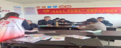 第四节、社工引导组员发挥自己的想象,根据组员自己的想法,集中注意力,心灵手巧,绘画不同漂亮的图案,有的画的空中热气球,有的画的牡丹花,有的镇定自若,有的手忙脚乱,在社工的支持和鼓励下,组员勇于展示自己,检验自己学习成果,绘画出不同的作品进行展示。