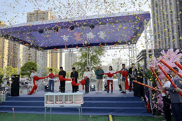 涪陵区商务委副主任戴小倩,涪陵区马鞍街道党工委书记毛晓东,百汇广场商管中心总经理李祺,百汇广场商管中心主任游群英,涪陵区微企协会会长王佳容,重庆麻辣明星黄角丫、周二毛、程琪琪共同为百汇广场“雾都喜市”开市剪彩。
