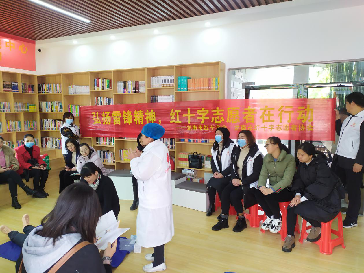 在第58个学雷锋日来临之际。为进一步普及应急救护常识,大力弘扬“人道、博爱、奉献”的红十字精神,增强安全意识,让广大群众了解急救自救知识,提高自救互救能力,使大家在遇到突发状况时能正确应对,江西省龙南市红十字志愿者协会特邀特邀红十字养老师资,应急救护培训师资、钟丽兰老师在龙翔广场新时代文明实践所开展“应急救护知识培训”志愿服务活动。