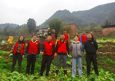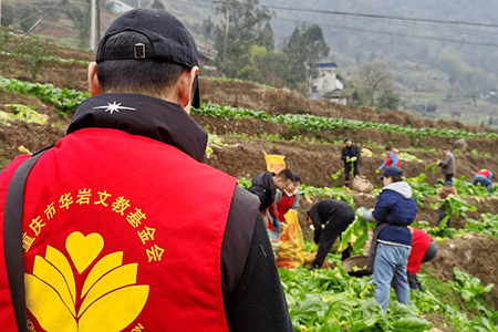当天上午9时许,队员们一行15人伴着绵绵细雨自带砍菜工具,身穿重庆市华岩文教基金会志愿者红色马甲驱车来到江东街道朝阳村4组绿油油的菜地。系上围裙,套上手袖,戴上手套,拿起砍菜的刀具在菜地里忙碌起来,队员们互相配合,分工合作,有的负责砍菜头,有的负责剔菜叶、有的负责装袋、有的负责搬运……在菜地里,一个个忙碌着的“红色身影”俨然成了一道靓丽风景线。