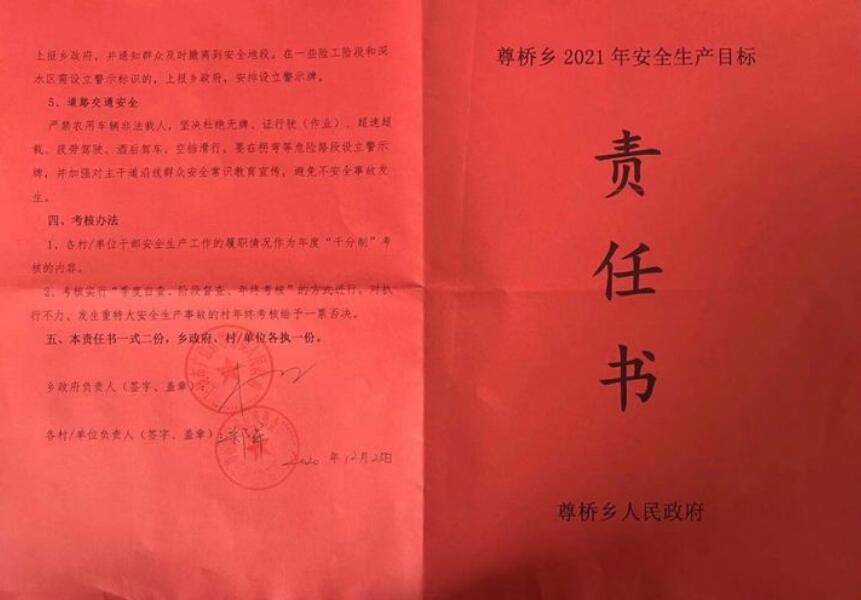 以责任落实为抓手,形成全乡上下共同抓安全生产的工作机制。一是成立安全生产督查组,重点督查各单位是否传达各级安全生产会议精神,是否认真学习习近平总书记关于安全生产重要论述,是否落实干部包干责任。二是乡长亲自带队到各村、各单位实地督查,查看各项工作是否落实到位。三是签订安全生产责任状,尊桥乡人民政府与11个行政村、所有驻乡单位全部签订安全生产责任状,把责任落实到每个单位,形成全乡上下共同抓安全生产的工作机制。