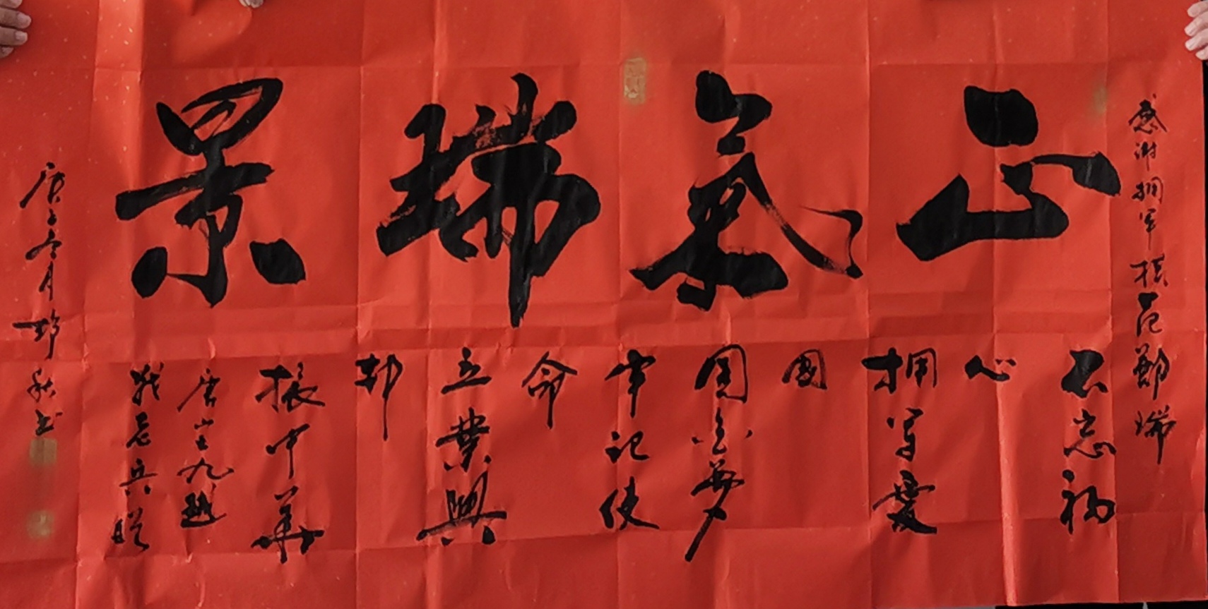 然后,由越战老兵代表,向拥军模范郑瑞先生,赠送了由著名诗人书法家王静秋先生创作的诗词作品和镜匾。