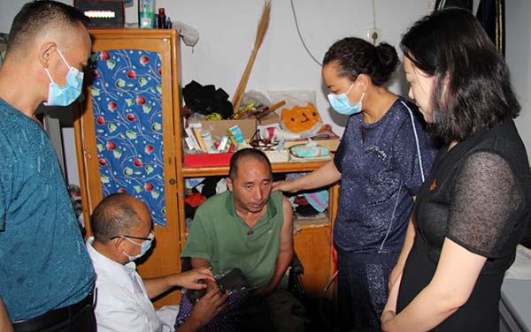 图为:裕心媛董事长张遂平(右2)和医务人员登门慰问高山镇李福杰患者。
