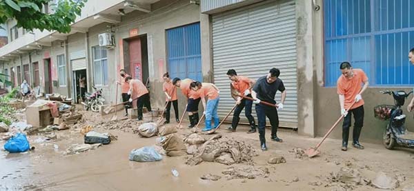 图为:裕心媛党员和员工在洪水后,义务清理街道!