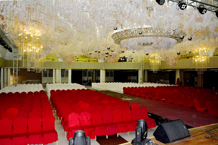 金色大厅位于酒店的一楼,舞台长24米、宽5米、高度90厘米;T台长15米、宽237厘米、高度50厘米;升降舞台高度60厘米、直径1米。场地长40米,宽32米,层高8米,可同时布置75个圆桌、容纳课桌式500人、剧院式1100人的会议。
