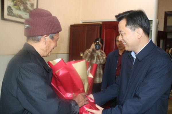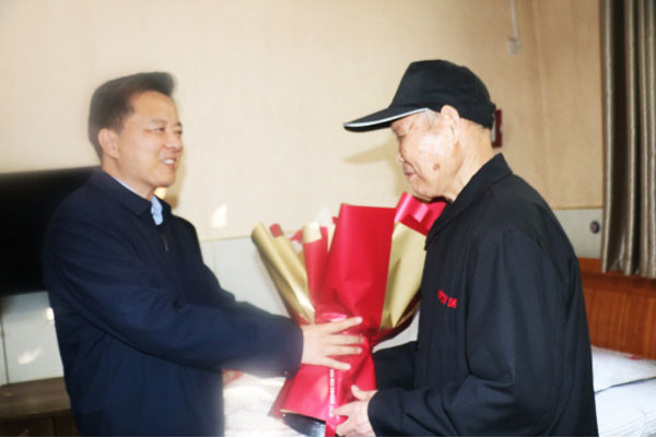 付万历向老人们送上鲜花,向他们表示节日的祝福。