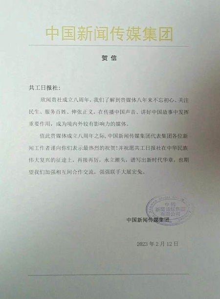 中国东盟传媒联盟讯(蓝乙人、蒙仕荣、蓝添译) 最近,中华环球卫视网络传媒集团记者从香港总部获悉,中国新闻传媒集团朱鹏源总编辑受应邀,特意为共工日报社成立8周年发来贺词。