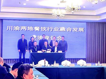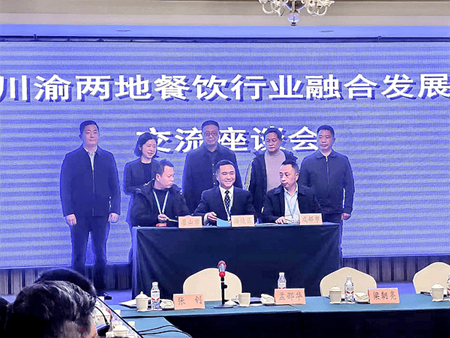 会上,四川成都、四川眉山、重庆涪陵三地餐饮协会分别签署了战略合作协议。涪陵区人大副主任阳森,区政府副区长靖开媛,区政协副主席刘加胜,重庆市商务委一级调研员刘盛超,重庆市餐饮行业协会会长张济东共同见证签约仪式。