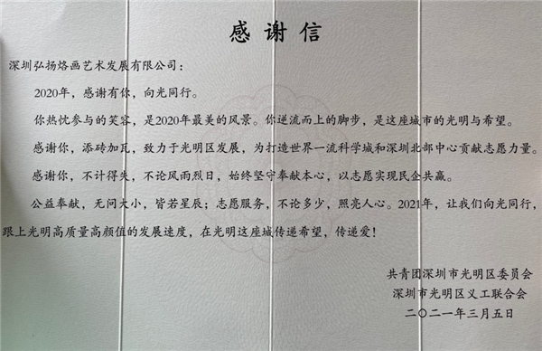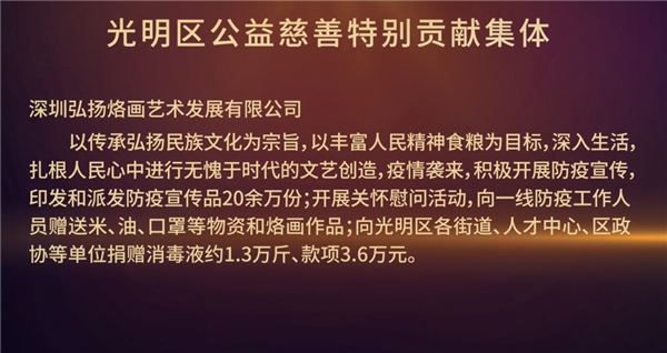 2021年3月5日,光明区纪念第111“国际三八妇女节”和第58个“三五”学雷锋日活动在光明科学城展示中心举办。深圳弘扬烙画艺术发展有限公司(以下简称“弘扬烙画”)获共青团深圳市光明区委员会和深圳市光明区义工联合会联名颁发的“公益奉献送关怀 志愿服务暖人心”奖杯以及感谢信一封,这是对弘扬烙画积极践行企业社会责任,坚持投身社会公益奉献的高度认可。
