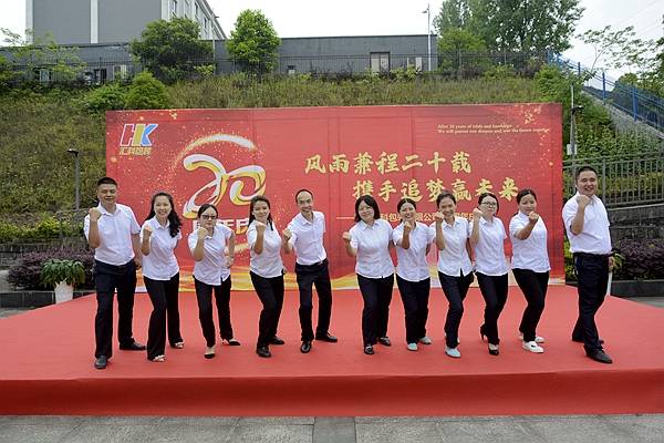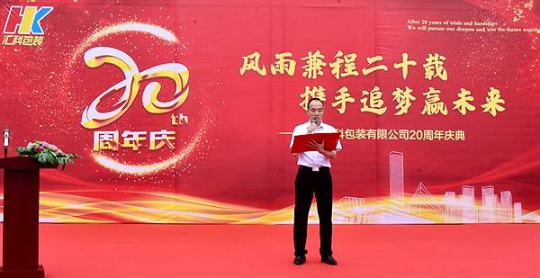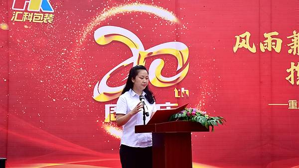 上午8:30分,重庆汇科包装有限公司董事长兼总经理刘平在致词中回顾了企业在20年来的风雨历程,他说:“从当初的一个小作坊企业发展成今天具有现代化规模的企业,员工从当时的几个人发展到如今的上百人,这些成绩来之不易,成果倍加珍惜,为曾经企业发展添砖加瓦用了五个‘感谢’来表达。最后,期待30周年的庆典再创辉煌。”