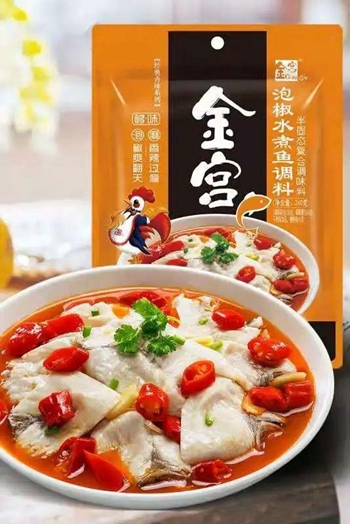 后龚德昭考虑到水煮鱼这道菜品做法形式多样,遂将其烹饪手法、调料进行深入研究,再结合当时川人的口味特点,研制出一种专为水煮鱼这道菜而制成的调料,让那些技艺不精的人也能做出美味可口的水煮鱼。百年过后,龚氏感慨于川派烹饪文化的博大精深,遂成立了金宫川派味业,以“让天下人拥有健康美味的生活”为己任,誓将川派烹饪文化发扬光大。也让金宫水煮鱼调料传统制作工艺得以鲜活地传承与发扬。