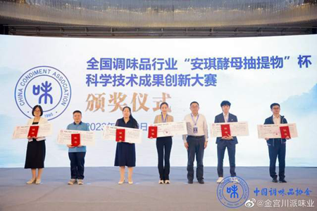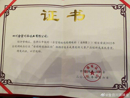 2023年4月19日,全国调味品行业科学技术交流大会在湖北省宜昌市圆满召开,金宫特级鸡精调味料 (金典装 )在大会上荣获2022年全国调味品行业“安琪酵母抽提物”杯科学技术成果创新大赛产品创新成果优秀奖。