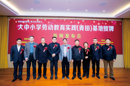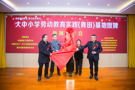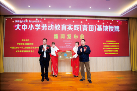 会上举行了授牌仪式,新闻局副局长张文祥女士,中央教育科学研究所学术委员会主任兼教育与人力资源研究部主任程方平先生,青田县人大副主任张晓军,青田县政协副主席刘新青,共同为“大中小学劳动教育综合实践(青田)基地”揭牌。