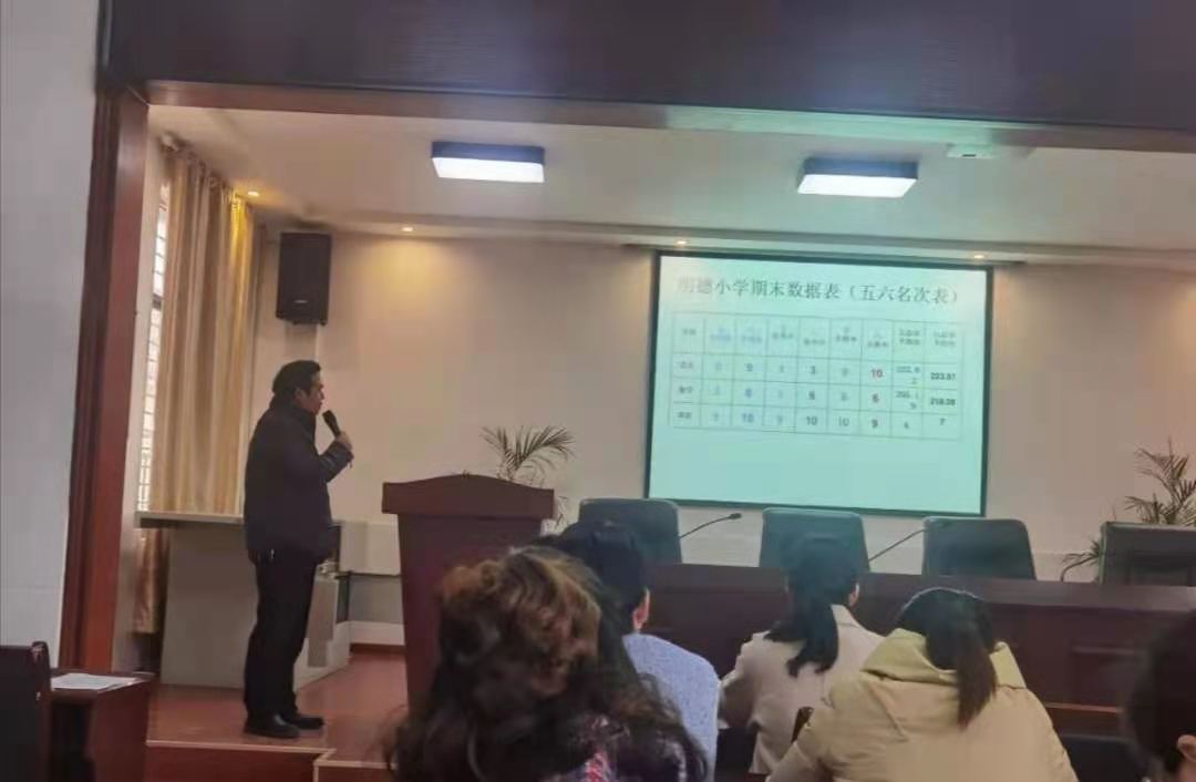 紧接着,教导处姜小清主任针对六年级上学期期末质检数据及素养班情况作了细致的分析,并在此基础上,对新学期教育教学提出了建议。他强调,六年级要科学规划教学进度,优化课堂教学;其次,要关注每一个学生,注重三科均衡发展;第三,要缩小两极分化,优化延时服务,提高教学质量。