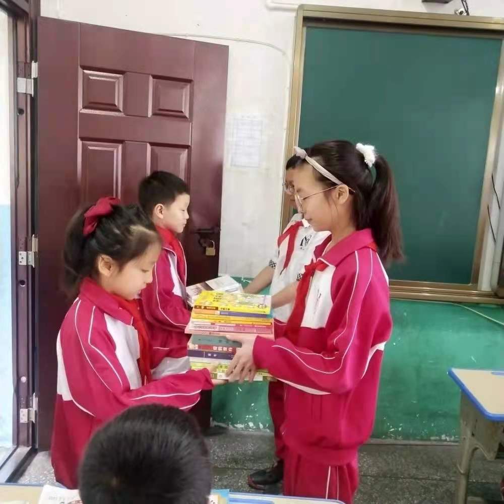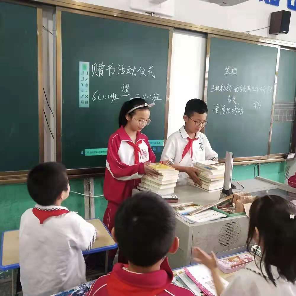 六年级毕业班的同学在即将离开母校之际,把自己心爱的书籍捐赠出来,留给母校,留给学弟学妹们,这些带着爱的温度的书本,从六年级学长学姐学手中传递到二年级学弟学妹手中,这些书本完成了上一轮光荣的传知、解惑任务,又开启了新一轮的使命。