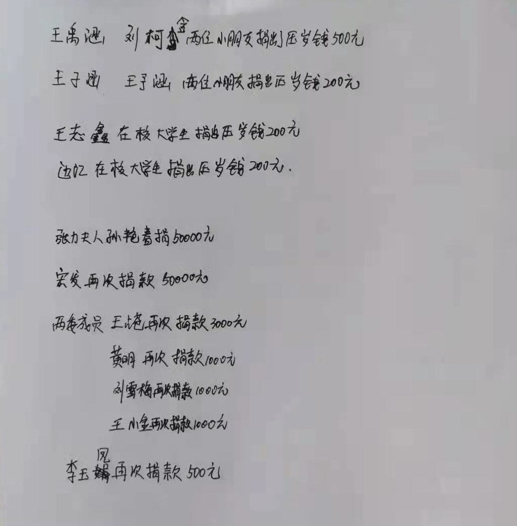 老党员姚进福、西万明股分弹簧厂、孙艳春建筑公司、村两委成员身先士卒,再次掀起捐款高潮,青年党员黄成再捐献图书馆一座,约5000元。在校大学生王志鑫、边江涌跃捐出压岁钱各200元,小学生王禹涵、刘柯含、王子涵、王予涵四位小朋友各捐款100元表达心意,笔者以为,不管是孩子们自发行为还是长辈们的支持鼓励,都是难能可贵的高尚精神文明之举。值得我们学习点赞。