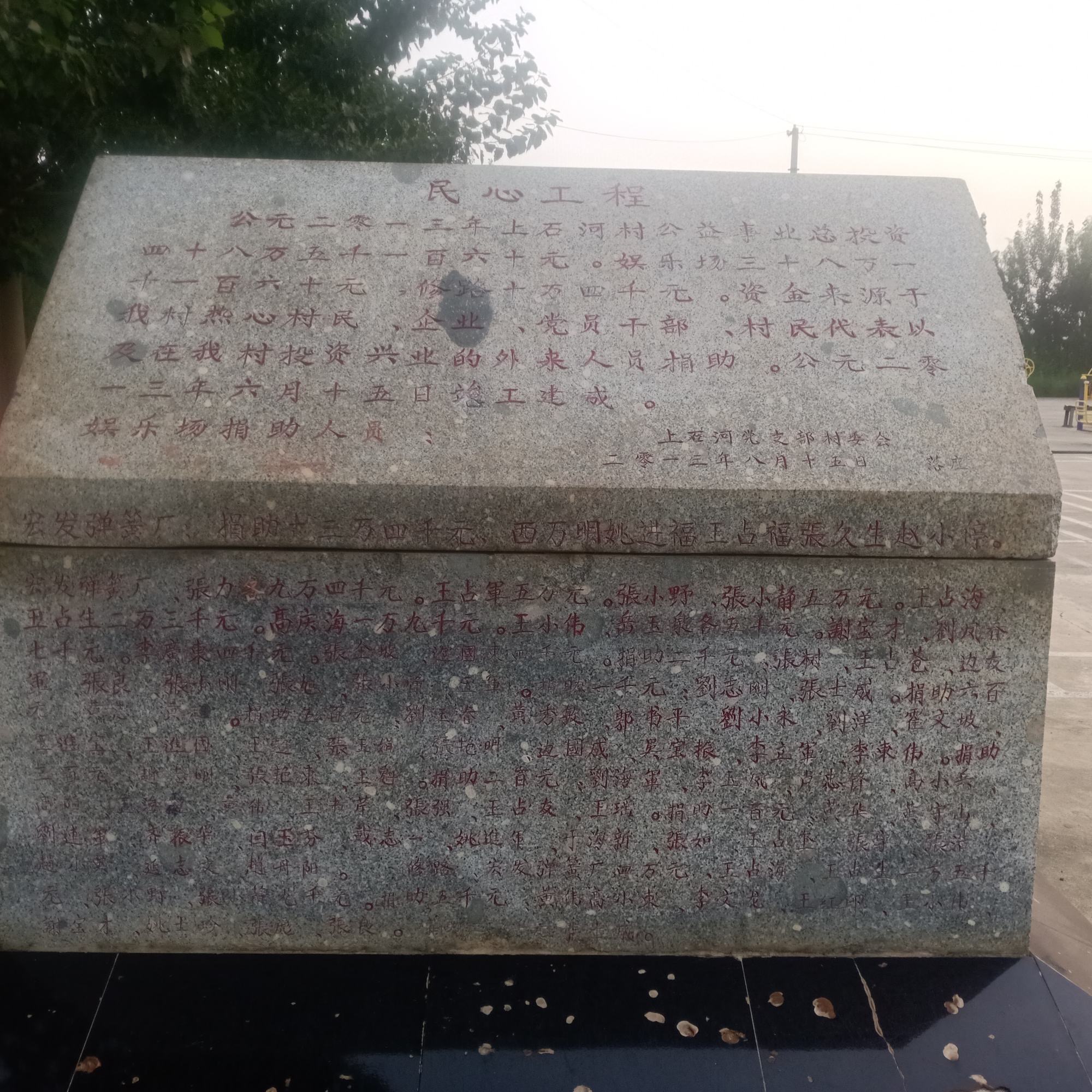 上石河村支部委员张力和本村企业宏发弹簧厂各股东,知道村里建设美好家园需要集资带头捐款并且利用本人关系和影响为本次活动引进多方企业投资十几万元充分调动了大伙积极性,为集资建路做出了好榜样。捐款现场一派热闹景象,村两委干部、村周边企业、村在外打拼的成功人士、各界社会名流、在外创业的热心青年和广大村民都踊跃捐款,就连未成年的小学生都把压岁钱拿出来捐到了村委会,这说明百姓们需要提高美好生活环境的愿望非常迫切,仅仅两天时间就捐款达到300000左右。看着这一组组数字,凝聚着党员和村民的一颗颗爱党、爱国、爱家乡的赤热红心。