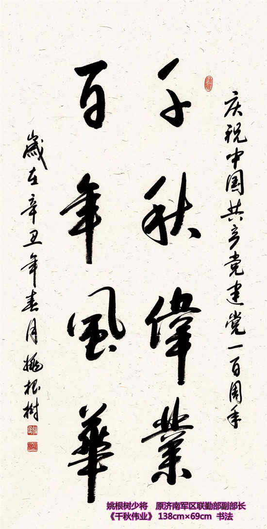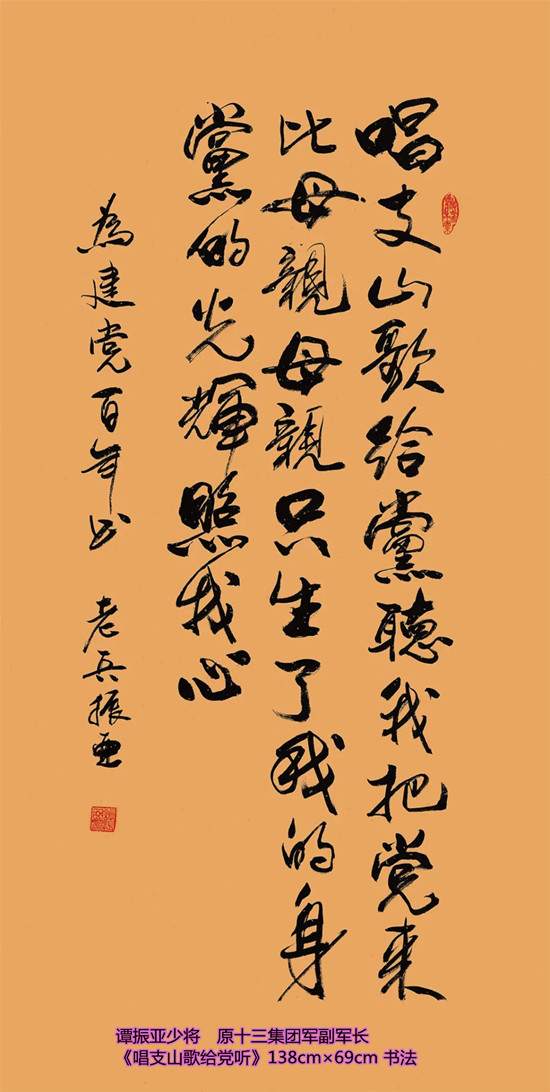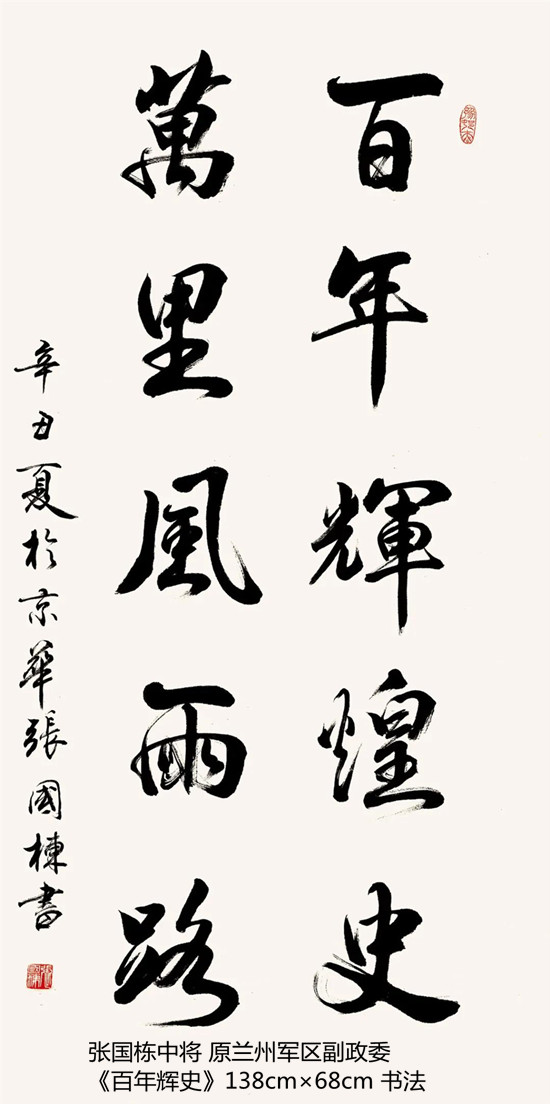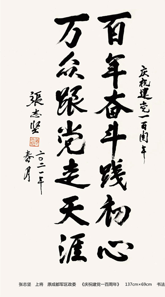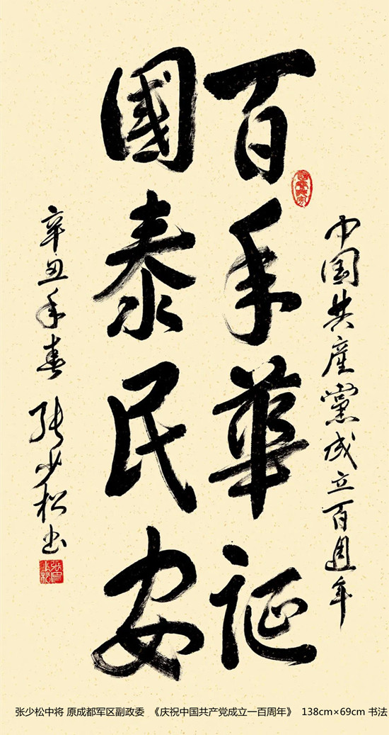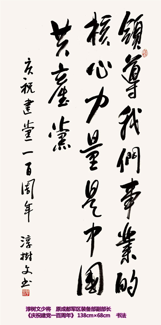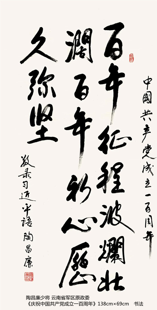 本次活动共收到来自老红军、老八路、老将军、老领导、军内外书画名家以及书画爱好者的优秀作品130余件。由于场地所限,经过评选,最终展出的作品有121件,其中书法作品69件,绘画作品52件。本次展出的书画作品,有的大气磅礴,有的行云流水,有的舒缓细腻,有的轻盈洒脱。欣赏这些作品,令人赏心悦目,不仅能体会到意境的深邃,还能感受到精神的高远。同时展现出艺术家们永葆艺术青春的精神风貌,这是艺术家们饱含深情向建党100周年献上的一份厚礼!