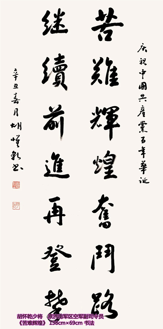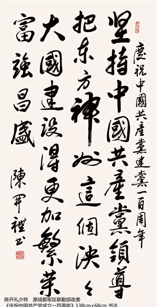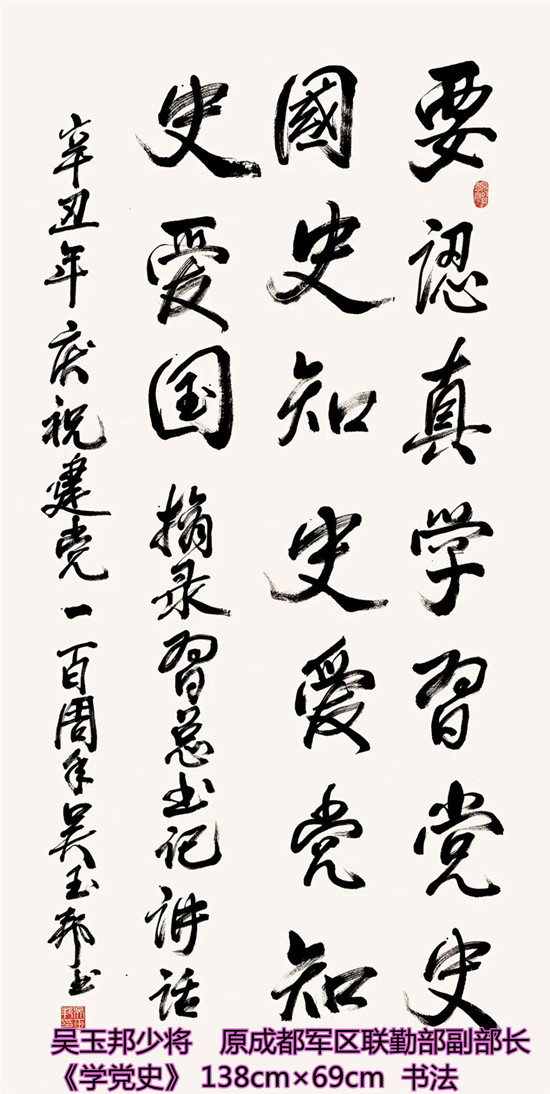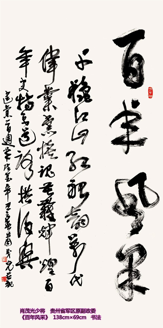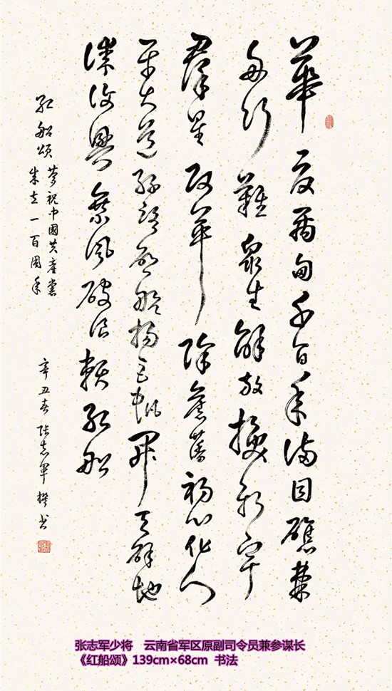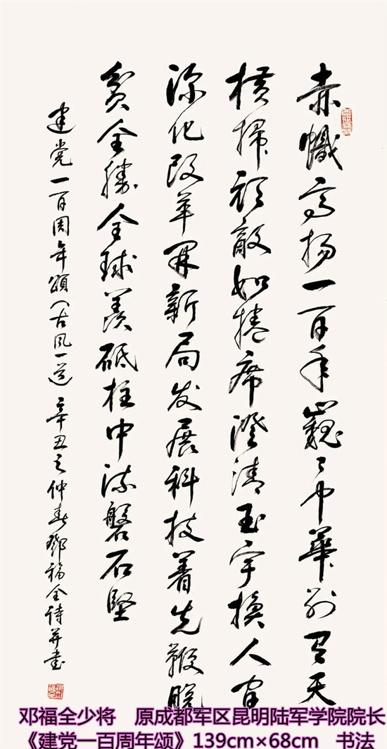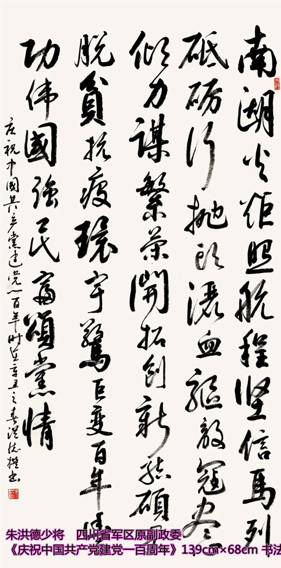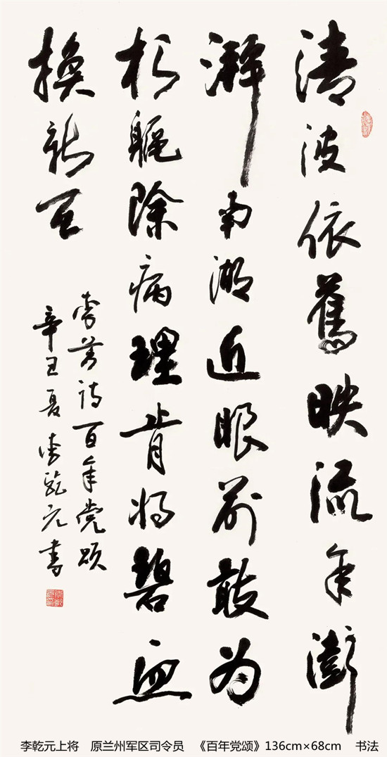本次活动共收到来自老红军、老八路、老将军、老领导、军内外书画名家以及书画爱好者的优秀作品130余件。由于场地所限,经过评选,最终展出的作品有121件,其中书法作品69件,绘画作品52件。本次展出的书画作品,有的大气磅礴,有的行云流水,有的舒缓细腻,有的轻盈洒脱。欣赏这些作品,令人赏心悦目,不仅能体会到意境的深邃,还能感受到精神的高远。同时展现出艺术家们永葆艺术青春的精神风貌,这是艺术家们饱含深情向建党100周年献上的一份厚礼!