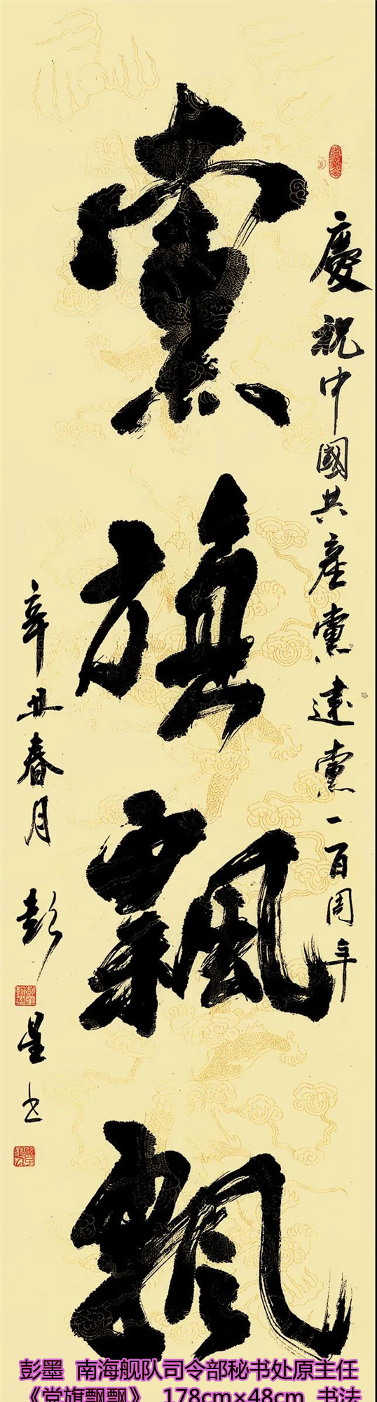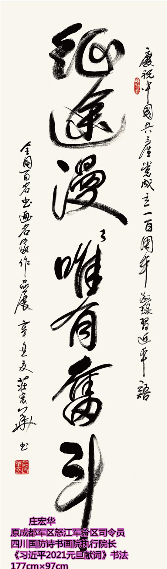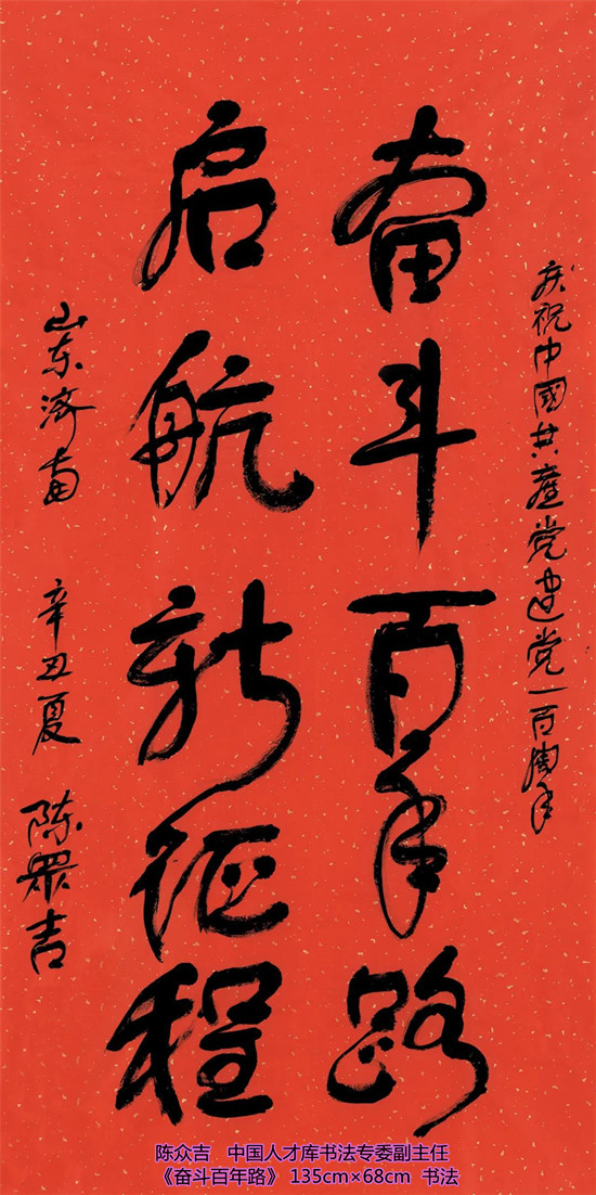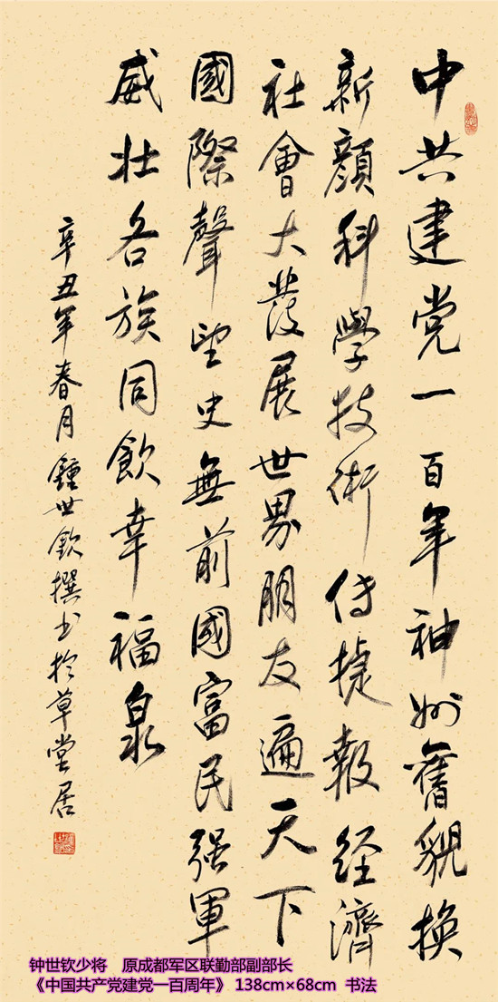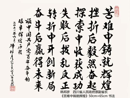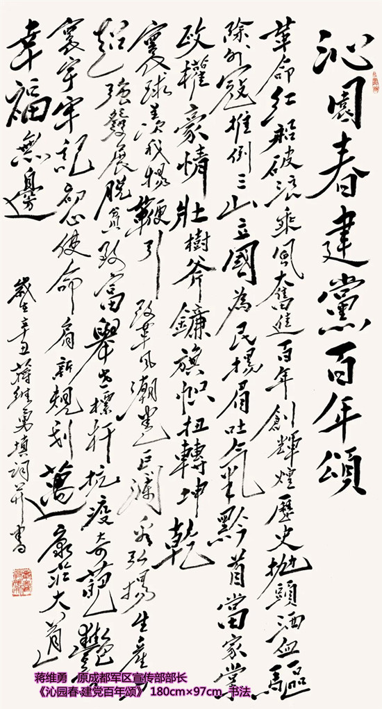 本次活动共收到来自老红军、老八路、老将军、老领导、军内外书画名家以及书画爱好者的优秀作品130余件。由于场地所限,经过评选,最终展出的作品有121件,其中书法作品69件,绘画作品52件。本次展出的书画作品,有的大气磅礴,有的行云流水,有的舒缓细腻,有的轻盈洒脱。欣赏这些作品,令人赏心悦目,不仅能体会到意境的深邃,还能感受到精神的高远。同时展现出艺术家们永葆艺术青春的精神风貌,这是艺术家们饱含深情向建党100周年献上的一份厚礼!