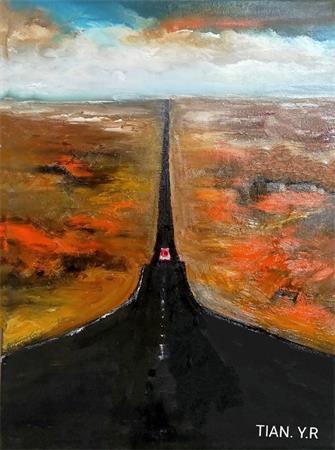 让我们暂且从醉酒的状态中清醒,还是回到“在路上”的主题。酒后不能驾车,好在我们不是“醉酒”,只是“醉色”,是田画家的色彩让人一时昏眩迷离。尽管迷离,在人生路上开车,可不能随便打盹儿,方向感不能偏离,万分专注是必须。画面的路上,车不多,确切地说,只有一辆,粉红的颜色惹人喜爱,预示者旅行者欢快的心情。此时,观赏者的心情也受到鼓舞,于是再仔细看画,离画面远一点儿看,忽然发现,这条笔直的柏油路,俨然一座高耸入云的黑铁塔。它的基座显得沉重而又庞大,因为它的高度实在太高,塔尖像是一把锥子,弄不好就会把天花板捅个大窟窿。