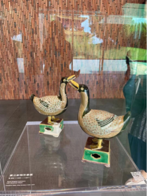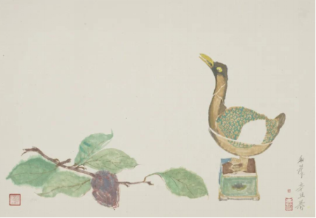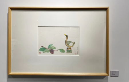另外,本次展览中还有非常有趣的作品《成化素三彩鸭形香薰》,这幅作品好似一幅国画花鸟小品,画中的香薰更像是一只栩栩如生的野鸭正在引颈高歌。素三彩一种彩釉名,其工艺是在没有上釉的素胎上用黄、绿、紫三色上色,鸭形香熏脚踩绿色底座,通体则可见三色与白胚交错,香薰旁还有树枝作为伙伴,清新脱俗,让人驻足而观。