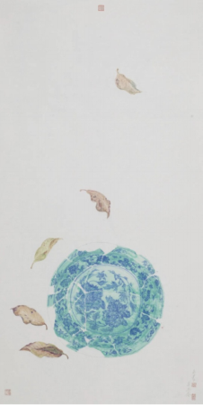 《永乐青花牡丹与玉兰的叶子》这件作品中,宿利群先生试图营造一种瓷器与植物在时空上的交错感。永乐青花牡丹是经时间与历史沉淀的古瓷,而玉兰的叶子则来自于宿利群先生家中种的广玉兰。瓷器以俯视的角度呈现在观者的面前。艺术家说,在他描绘这件瓷器时,他似乎感受到了工匠在制作这件瓷器时的喜悦与轻松,盘上的牡丹与莲花似乎也显得怡然自得;空中的玉兰叶子,则是以平视的角度落在瓷器的周围,这样时空的错位,也恰似宿利群先生与古人通过一件瓷器而产生的对话。