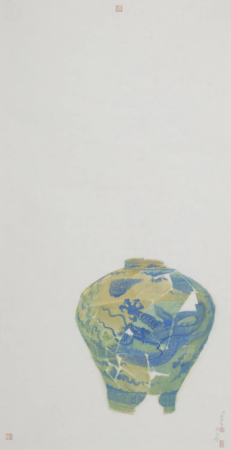 而《宣德青花龙纹罐》则是宿利群先生以另一种角度描绘的同一件瓷器,在这件作品中,艺术家充分利用了熟宣的特性,将罐子的颜色根据瓷片不同的位置晕染出不同的形态,并对他心中画面的主题”龙”进行着重的表现:龙重点表现了龙头、龙须等,而身体则做了隐藏的处理,这样龙在青花罐上好似隐藏在云层中,若隐若现,与观者形成互动。