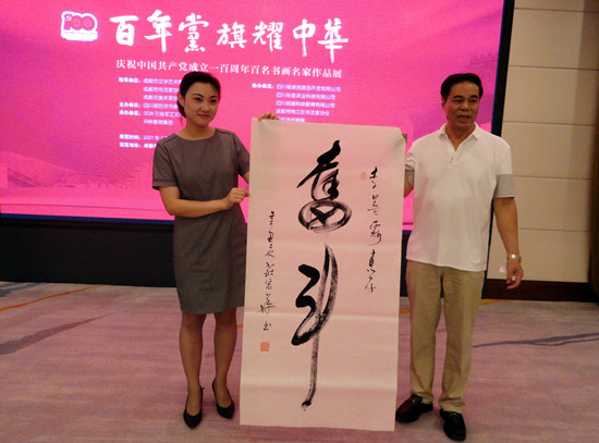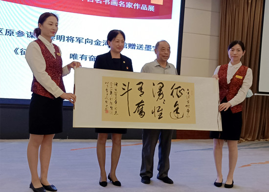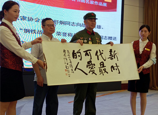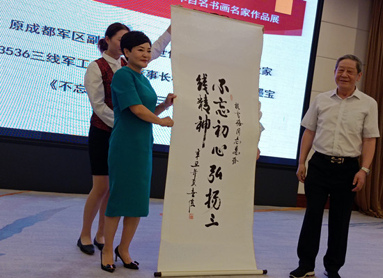 开幕式上,原成都军区副司令员陈世俊将军、原成都军区副政委张少松将军、成都市书法家协会主席舒炯、四川省军区原参谋长张培敏将军、国务院三线建设调整办公室原主任王春才、原成都军区装备部副部长淳树文将军、原成都军区联勤部副部长钟世钦少将代表四川省军区原副政委黎明将军等老将军和著名书画家,分别向一级英模、被中央军委授予“钢铁战士”称号的肖家喜,以及3536三线军工文创园董事长桂雪梅、丹秋教育集团董事长李元渠、金河宾馆等爱心企业家代表赠送墨宝并合影。
