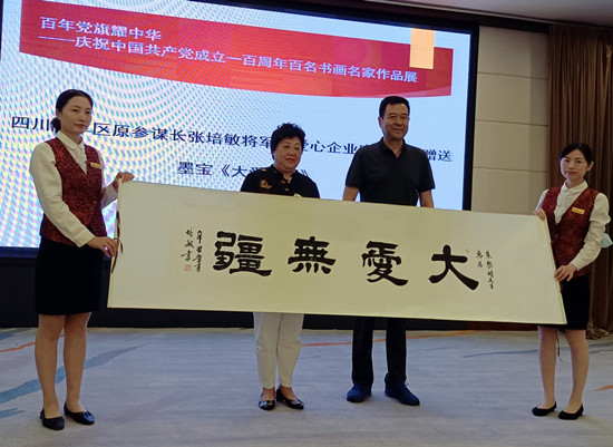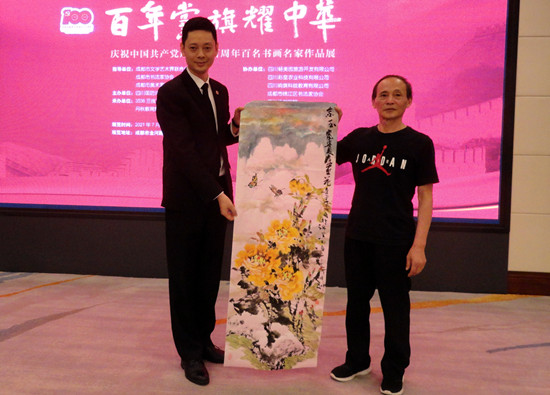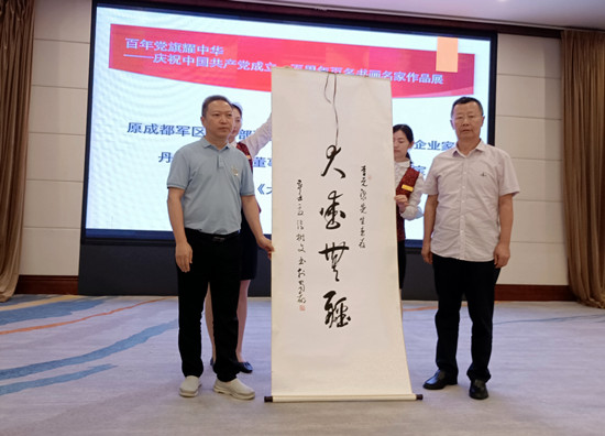 本网2021年7月12日四川成都讯(记者 刘昕 摄影报道) 丹青书盛世,翰墨颂党恩。在举国上下庆祝中国共产党成立100周年之际,由成都市文学艺术界联合会、成都市书法家协会、成都市美术家协会指导,由四川国防诗书画院和3536三线军工文创园、丹秋教育集团共同举办的“百年党旗耀中华——庆祝中国共产党成立100周年百名书画名家作品展”于今(12)日在成都隆重开幕。本次展览共展出来自全国100名书画名家的121幅作品,其中书法作品69件,绘画作品52件。四川省原副省长韩邦彦在开幕式上发表热情扬溢讲话。原成都军区副司令员陈世俊中将宣布书画作品展开幕。开幕式由本次活动筹委会秘书长梁欣主持。