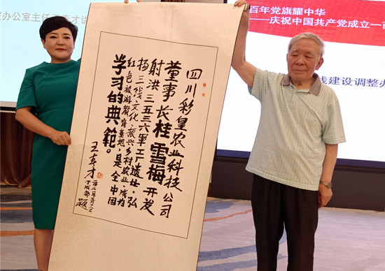 (国务院三线建设调整办公室原主任王春才向爱心企业家桂雪梅女士赠送墨宝)
