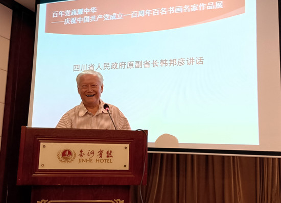 “今天,我们四川国防诗书画院的艺术家和军内外的书画爱好者,挥毫泼墨,浓墨重彩,歌颂党的丰功伟绩,歌颂党领导人民进行社会主义建设取得的辉煌成就,歌颂未来的宏图大业。我们欣喜地看到,艺术家和书画爱好者们饱含着对祖国优秀传统文化的深情表达出对中国共产党的热爱!”四川省人民政府原副省长韩邦彦在致辞中表示,“本次展出的书画作品,主题鲜明,内容丰富,从不同的角度抒发对党、对祖国的热爱,讴歌了中国共产党领导人民开展革命斗争和社会经济建设取得的伟大成就。”
