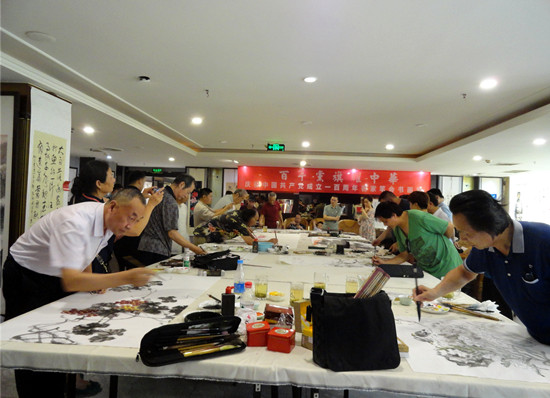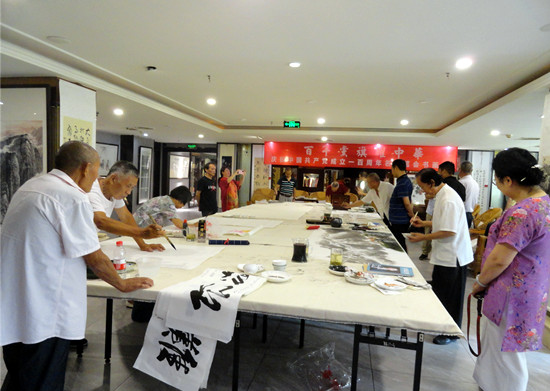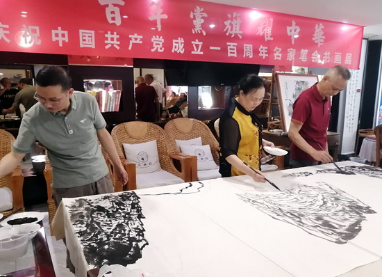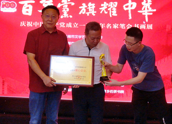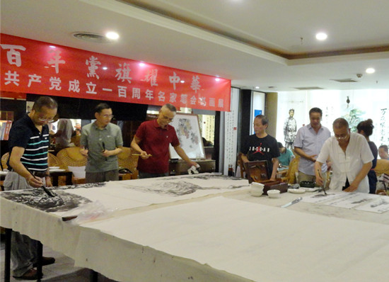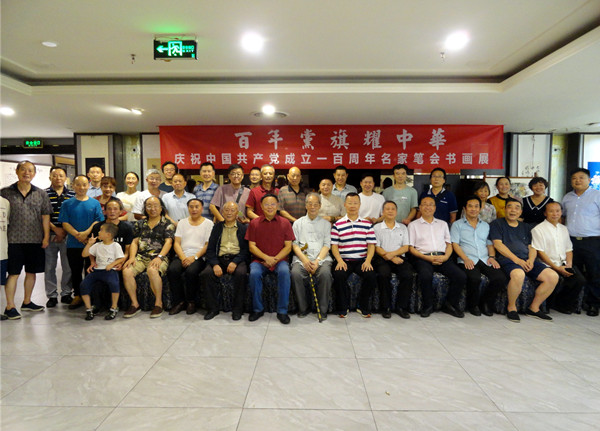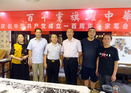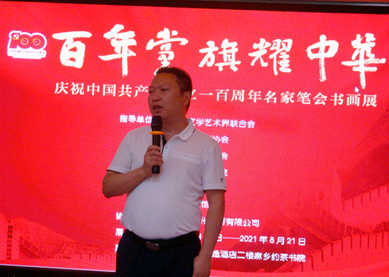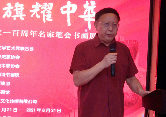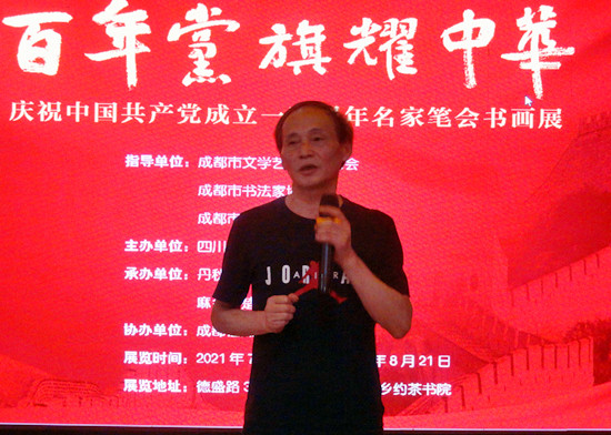 本网2021年7月21日四川成都讯(记者 刘昕 摄影报道)礼赞共产党,丹青绘山河。7月21日,由成都市文学艺术界联合会、成都市书法家协会、成都市美术家协会指导,由四川国防诗书画院和3536三线军工文创园、丹秋教育集团等单位共同举办的“百年党旗耀中华——庆祝中国共产党成立100周年百名书画名家作品展”全国书画艺术名家笔会在成都市星逸酒店麻乡约茶书院盛大举行。成都市文联副主席王吉祥,成都市美术家协会主席姚叶红,云南省军区原副司令员兼参谋长张志军将军,原十三集团军副军长谭振亚将军,原成都军区装备部副部长淳树文将军,四川国防诗书画院名誉院长、96岁高龄的全国著名花鸟画家、国家一级画师邵仲节,丹秋教育集团董事长、爱心企业家李元渠,本次活动总策划、四川国防诗书画院执行院长、原成都军区怒江军分区司令员庄宏华,以及胡真来、施秉伟、陈明德、周泰惠、邵大光、任兴发、李徐波等著名书画家和其它社会各界代表,计200余人参加了当日活动。