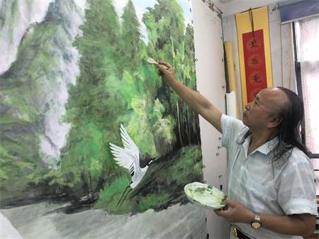作者徐才望今年82岁,自幼喜爱书法和绘画,擅长隶、行、草书法和油画、国画、人物和山水画,其作品受到党和国家领导人的好评和收藏。这幅“鹤翔吉地”山水画中飞翔的鹤是长寿之鸟,青山绿水是健康长寿的地方,寓意在中国共产党的领导下,我国各族人民生活幸福健康长寿。(艾世民)