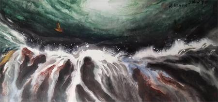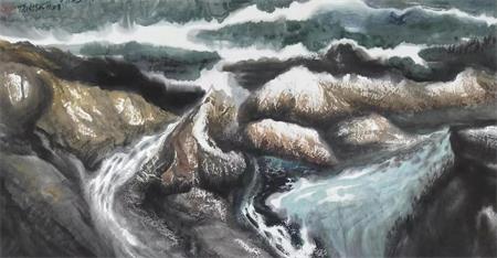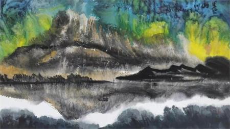 在指点江山里,他将拓墨中的水拓、渍墨等创作技法表现的淋漓尽致,出神入画。